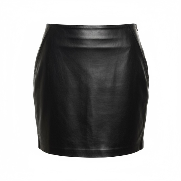Chic plus size black leather skirt. Sleek design with front pockets. Perfect for a modern fall and winter look.