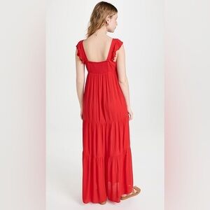 The ready or yacht dress is a textured cotton maxi dress with buttons down the front and ruffle sleeves.