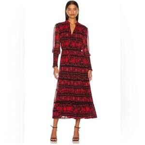 This stunning red and black floral midi dress from BB Dakota by Steve Madden is a captivating and romantic piece, perfect for a variety of occasions. The dress features a flattering silhouette with a V-neckline and tie closure, long blouson sleeves with smocked cuffs, and a tiered skirt. Made from a lightweight georgette fabric, it is both stylish and comfortable. The dress is partially lined and has an elastic waistband for an easy pull-on style. This "twirl-worthy" maxi dress is a showstopper that can be dressed up or down.