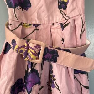 Under arm zipper. Fit and flare with belted waist. Pink and Purple large flower design. Belt has light soiling.