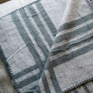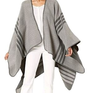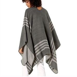 BB Dakota reversible poncho, great for all seasons. Light gray reverses to dark gray with contrast stripe detail. There is a small pull, and in some places, dark gray threads show through to the light gray side. Please see photos for details. Good used condition.