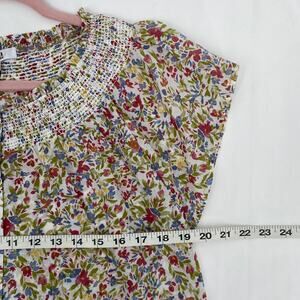 Allover blooms brighten this crisp cotton blouse styled with a smocked yoke and fluttering sleeves.