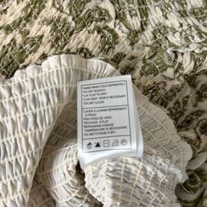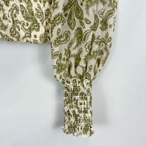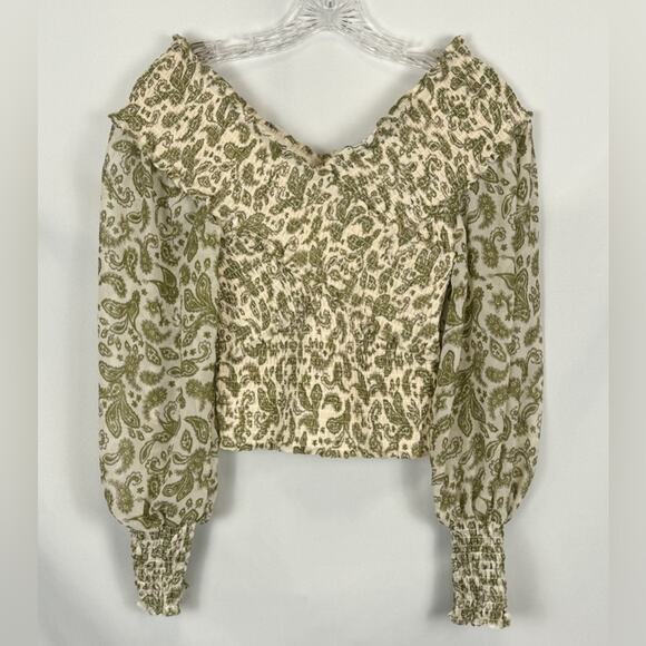 Steve Madden smock factor top size small. Cream with olive paisley print. Off the shoulder style with fitted bust and bodice. Smocked V-neckline. Long balloon sleeves with elasticized cuffs.