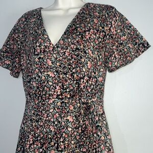 In excellent preowned condition. Floral mini dress. Flounce hem. Surplice neck. Drawstring down the front of the skirt with flattering ruching. Woven cotton.