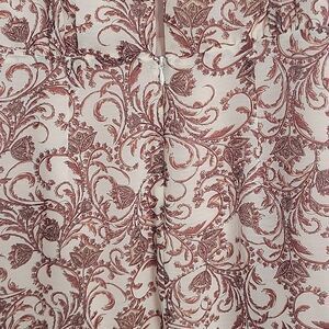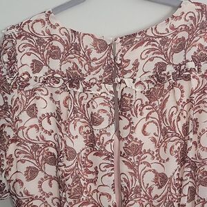 Swirling vines and detailed flowers pattern a sweet, faux-wrap dress fashioned with a frilly ruffle hem.