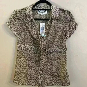 BB Dakota White Brown Button Front Leopard Print Top Blouse M Anthropologie NWT