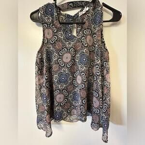 BB Dakota sheer fully lined ruffled sleeveless top with key hole back