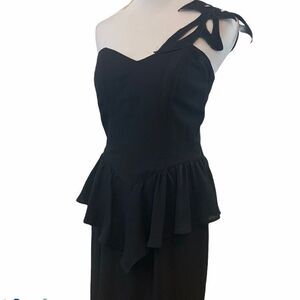 Sweetheart neckline with one shoulder AMAZING shoulder strap cutout detail. Peplum flounce, and small slit in back.