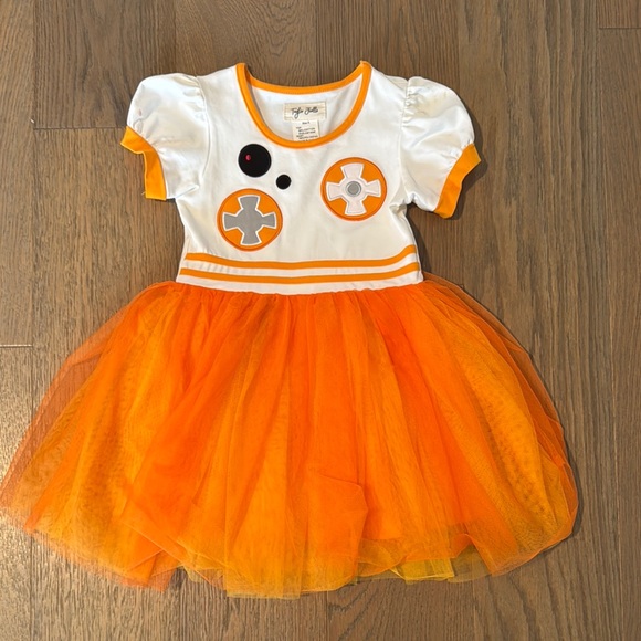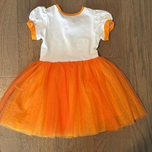 Adorable orange and white dress with tulle skirt. Features playful designs on the top.