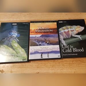 Special edition DVD set featuring 'Winged Migration' and 'Life in Cold Blood.' and 'Life in the Undergrowth'. by David Attenborough. Perfect for nature enthusiasts. 3 pack for the price of 1..Great deal!!