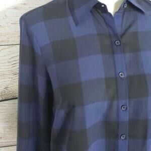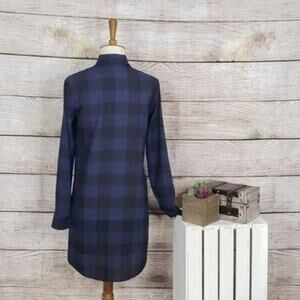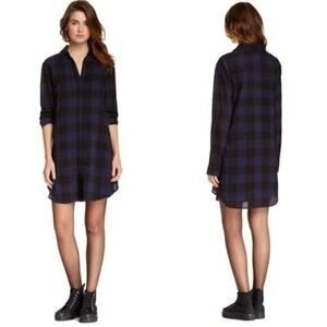 BB Dakota Button Down Keenan Dress. Sheer fabric -- can wear open as a long duster or as a dress with a slip underneath. Purple and black checkered pattern. Collared. Size XS. Long Sleeves. Button Cuffs. Rounded Hem. Excellent Used Condition. 100% Polyester.
