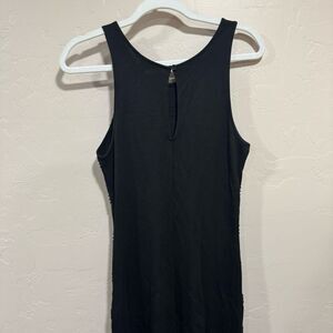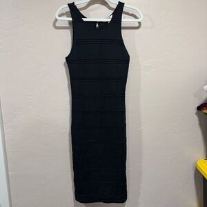 Black midi length jersey bodycon dress. Button keyhole closure