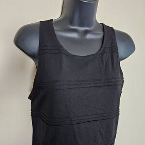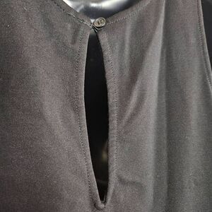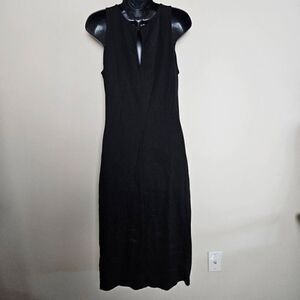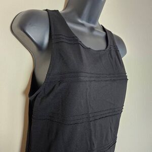This is a sleeveless bodycon dress by BB Dakota. It is black and has textured stripe detailing as shown in the photos. On the back is a keyhole opening which is closed with a small button.