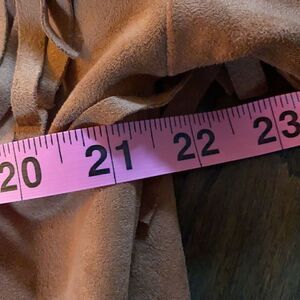 Westworld is a western-inspired faux suede jacket with fringe trim, oversized fit, and button front with zipper closure.