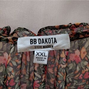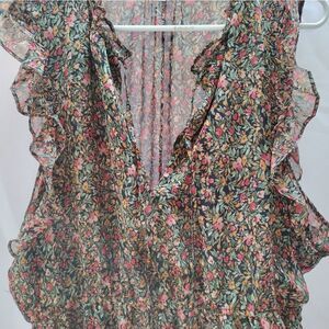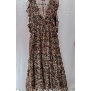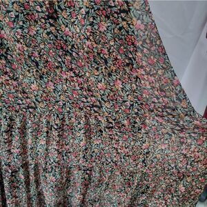 semi sheer, layered ruffle dress. floral, polyester. skirt is lined. pit to pit 23", waist 18, length 52"