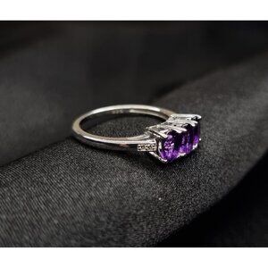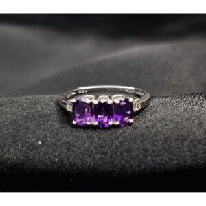 This stunning ring features three brilliant, oval-cut natural amethyst gemstones. Amethyst, the beautiful purple variety of quartz, is known for its rich, vibrant color. The stones are prong-set in a classic three-stone design, symbolizing the past, present, and future, making it a perfect gift or self-purchase.
