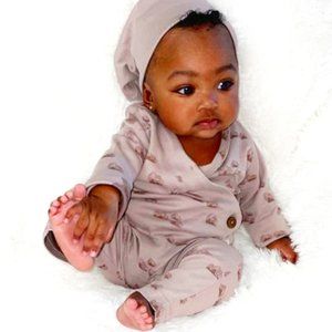 The neutral-colored printed baby kimono romper has a front overlap romper/jumpsuit is made from the softest 100% GOTS-certified organic cotton fabric, with no harmful chemicals used in processing, dyeing, or printing stages. The coconut button on the overlap front makes changing easy and the dropped crotch and wider hip area provide room for bulky diapers.