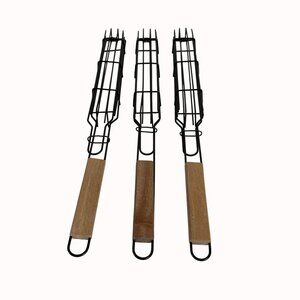 BBQ Grill Basket Skewers Set of 3 Wooden Handles Picnic Tailgate Home Grilling Cook Small Foods Vegetables Cut Meat Seafood Shrimp Fish