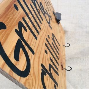 Grillin & Chillin BBQ sign with bottle opener and hooks to hang grill tools up with