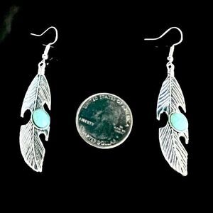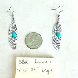 BBR Southwest Native style Silver & Turquoise 2 1/2 Dangle Earrings. A great value of striking earrings at value pricing. Sterling Silver plated with Turquoise howlite accent. Let’s make it yours!