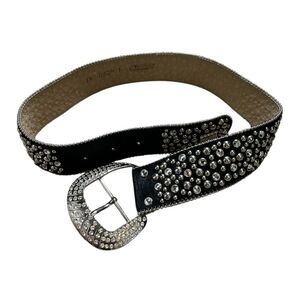 Elevate your style with this chic black belt adorned with silver studs. Perfect for adding a touch of glamour to any outfit.
