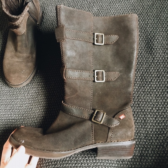 Brown leather boots. Buckles on sides. Zips up on the inside. Good condition.