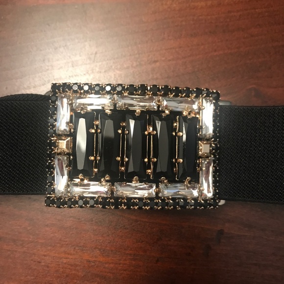 1-1/2" wide adjustable belt from 19"-24" but is stretchy. Black, clear and gold stones. Perfect condition only worn once.