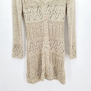 Cardigan is a cream color. Has stretch to it and looks good button upped or worn open.