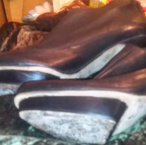 Beautiful supple black leather with back zipper 5" heel, 1" wedge front platform..size 10 by BCBG. Worn twice..wood soles no wear there or heels.