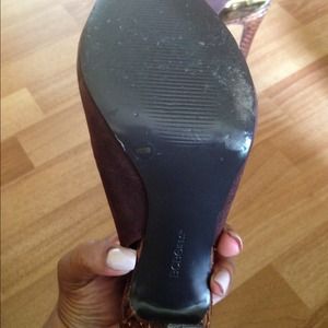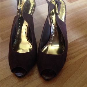 Brown suede BCBG pumps sling back with snake skin heal. Great for the office. NO TRADE! must go