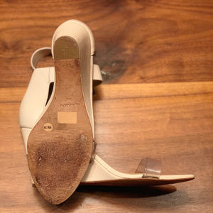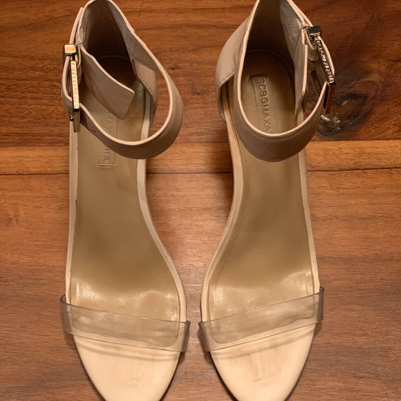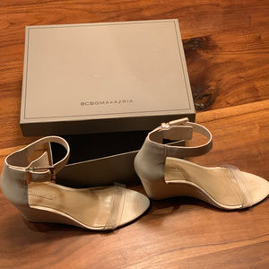 Open toe - Transparent front strap - Open vamp - Closed back with wraparound ankle strap and side buckle closure - Wedge heel - Approx. 3" heel