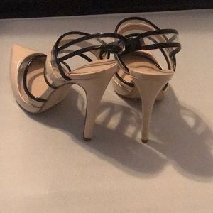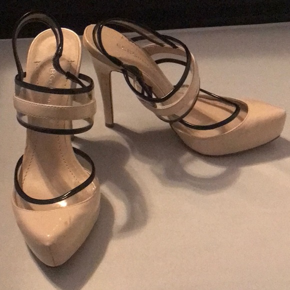 Patent leather beige with clear vinyl black trim slight platform. 5 inch heel Slightly worn. Super cute