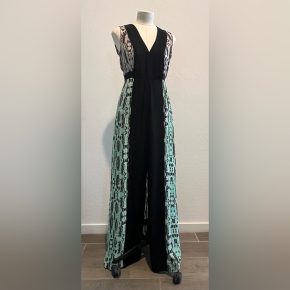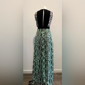 •Plunging V-neck•Sleeveless•Back keyhole with button closure•Allover pattern•Contrast color-blocking at neckline and center front•Center back zipper closure•Front slit detail•Georgette: Polyester•Partially Lined•Hand Wash•Color: Kelly Green Combo