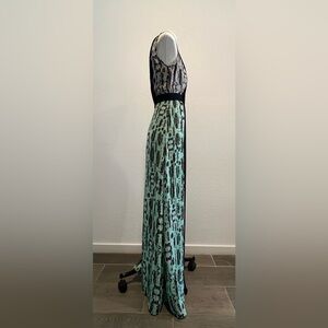 The plunging neckline and unparalleled print on this long, luxurious dress will leave a lasting impression of elegant, progressive style.