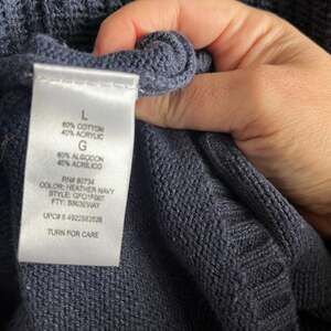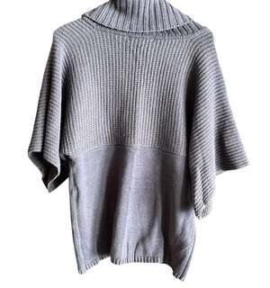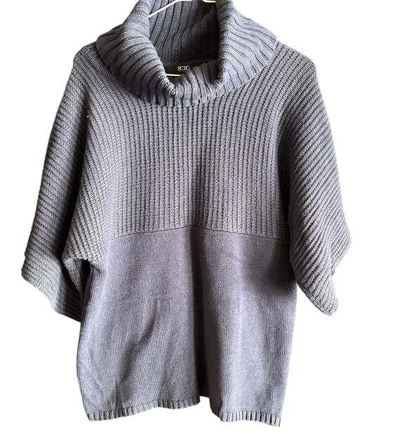 BCBG Paris Cowl Neck Poncho Sweater, Heather Navy, Women's Size L. This stylish and cozy sweater features a chunky ribbed knit cowl neck and short poncho-style sleeves. Crafted from a soft cotton-acrylic blend (60% Cotton, 40% Acrylic) for comfortable, breathable wear. The color is a versatile heathered navy blue that pairs easily with jeans or leggings for a chic fall or winter look. Good pre-owned condition with no visible holes or stains. Turn for care instructions.