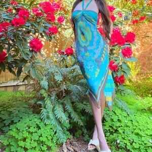 Vintage BCBG aqua blue/green 100% silk floral bias cut handkerchief halter dress in size 0!🩵🦋