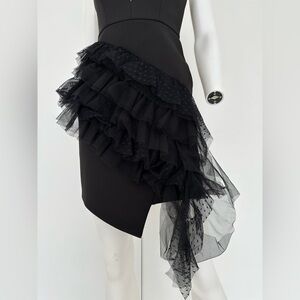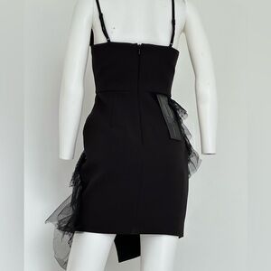 This strappy, mini sheath dress is designed with a V-wire neckline and dot mesh inset. It's finished with an asymmetrical ruffled skirt and hemline. Adjustable straps, brand new with tag, as you can see in the video there is a little pull in the front mesh which can be easily fixed.