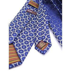 This BCBG Attitude tie offers a refined touch to any professional wardrobe. Designed with a striking blue and white circle pattern, it's crafted from luxurious silk, providing a sleek and polished finish. Ideal for adding style and sophistication to business attire.