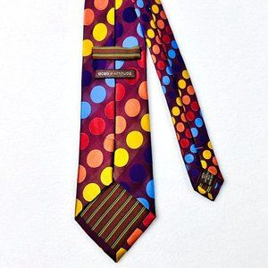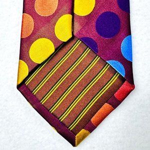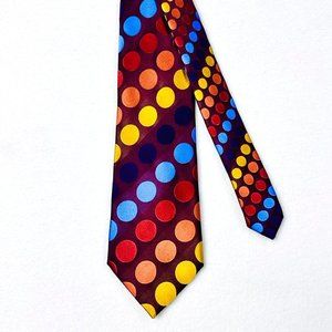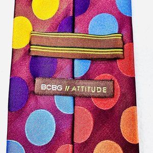 BCBG Attitude silk neck tie. Love the colors! The circle colors are actually on the earthy side but have a slight metallic sheen. Likewise, the background diagonal stripes alternate between matte and polished. Length is 58" with a 3.5" width. Good overall condition. No stains or flaws noted and colors are great.