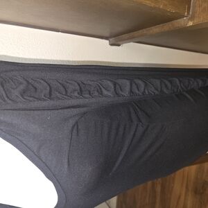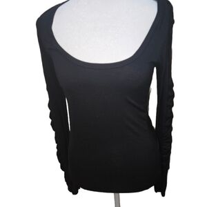the front of this shop is very low cut but very fitted also has scallops design on the sleeves and believe me this top makes anything sexy. size is xs however lots of fitted stretch.