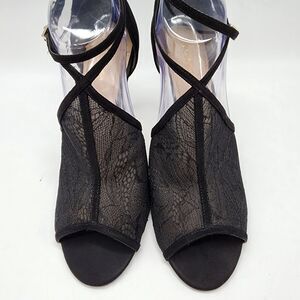 BCBG Black Mesh Floral Lace Stiletto Heels Size 11 Ankle Strap Open Toe Wedding