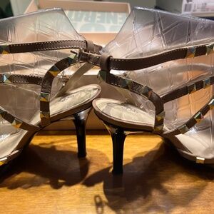 Beautiful BCBG Generation black and tan with gold studs heels worn 2xs. Sz 9. Medium width. 4” heel. Black patent. No scratches. No scuffs on heel. Box kept. Similar to couture designer shoe. Perfect for spring and summer!