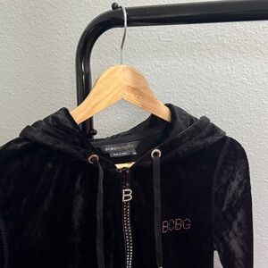 Chic BCBG velvet hoodie. Soft and stylish. Perfect for casual wear.