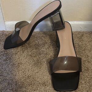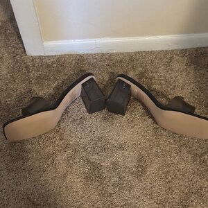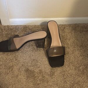 Chic BCBG mules with a sleek black base and stylish brown strap. Perfect for elevating any outfit.