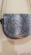 This BCBG crossbody bag showcases a striking black and gray snake print, offering a sophisticated and modern look. The bag's half-moon shape and metallic gold chain strap add a touch of elegance, making it a versatile accessory for any occasion. Its faux snakeskin texture enhances its luxurious appeal, ensuring you stand out in style.