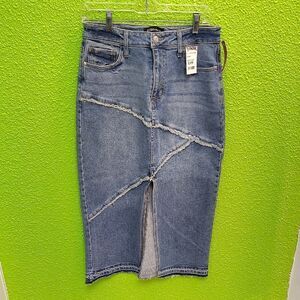 This BCBG skirt features a striking asymmetrical design with a stylish slit, crafted in a classic blue hue. Its midi length and pencil silhouette make it perfect for casual occasions, offering a chic and modern look.