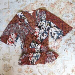BCBG floral mixed print wrap top in excellent preloved condition. Size is women’s XS. Super lightweight and flowy material, perfect for warm weather or for laying in the fall. Features gorgeous sleeves and a flattering smocked waist.