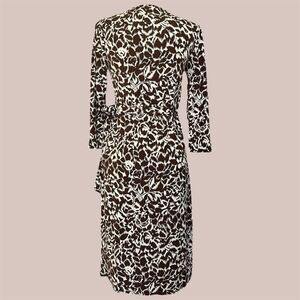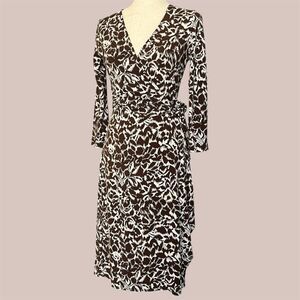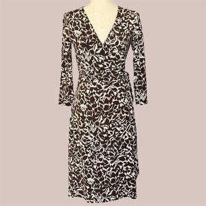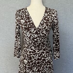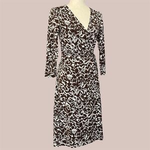 BCBG Brown Floral Wrap Dress Size S Stretch Classic Career Office Made in USA
