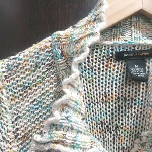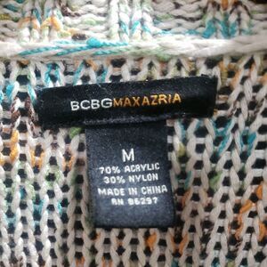 This BCBG cardigan is a must-have for any fashion-forward woman. Made with a blend of acrylic, this sweater features an open-knit pattern with raglan sleeves and a V-neckline. It comes in a multicolor design and features colorful accents, making it perfect for any occasion, whether casual or dressy.