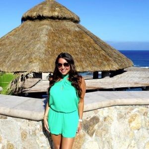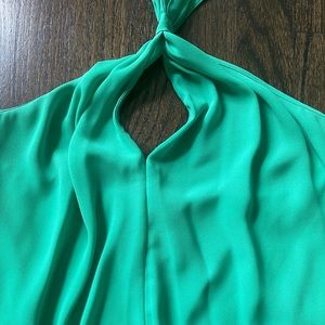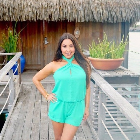 BCBG Casli crossover halter romper jumpsuit in Emerald Green. This gorgeous romper features a keyhole tie neck halter back with elastic, an elastic waist, a soft and Lightweight polyester fabric and satin ribbon hangar loops. Perfect for pool days or beach trip to wear to a party dinner or lunch!